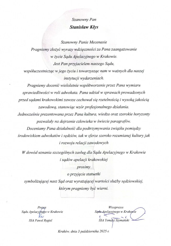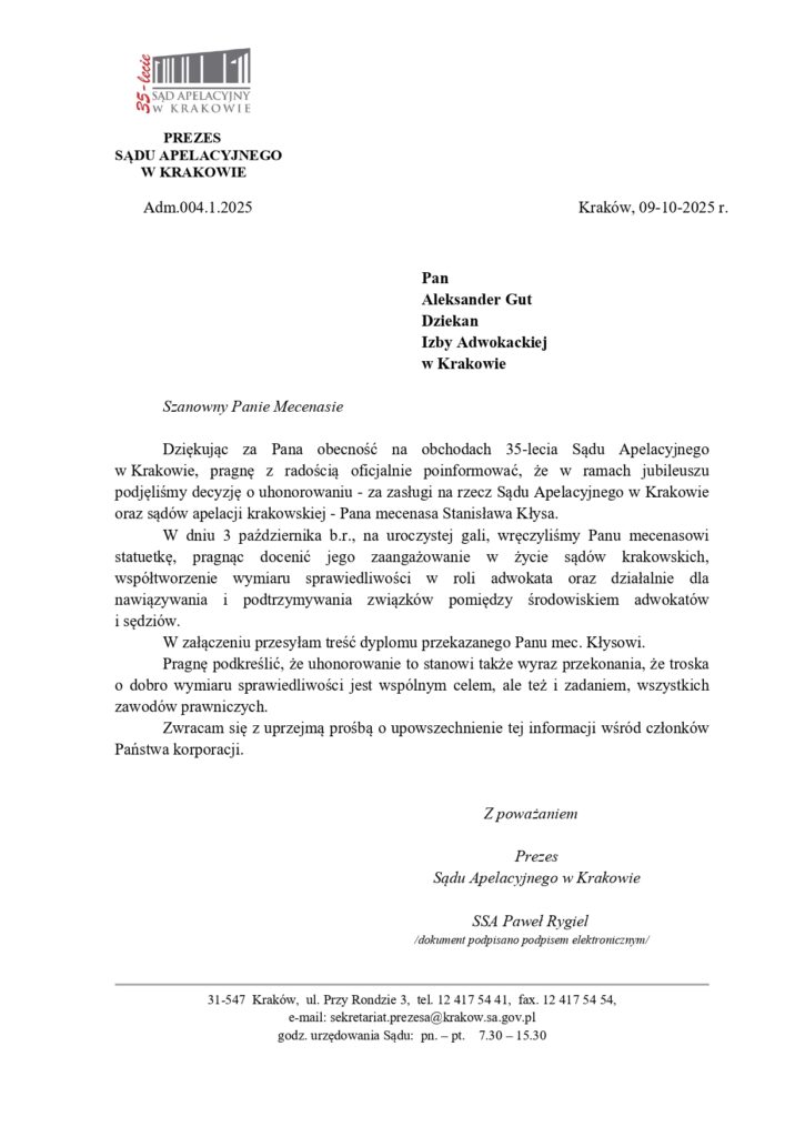 Pismo Prezesa Sądu Apelacyjnego w Krakowie z dnia 09 października 2025 r.