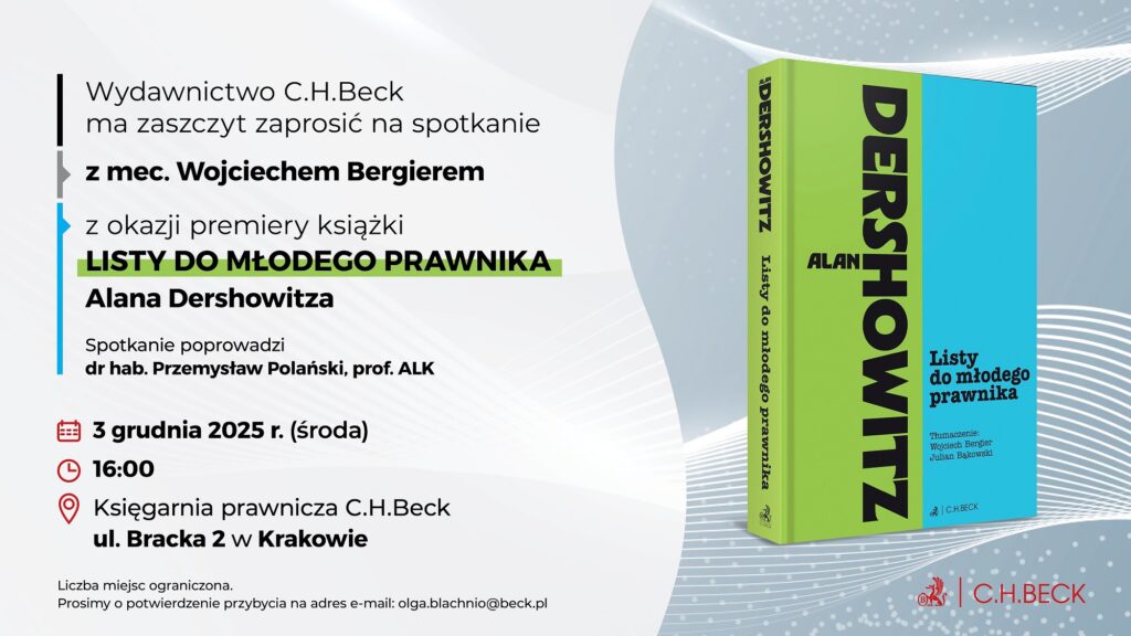 Spotkanie odbędzie się 3 grudnia 2025 r. (środa) o godz. 16.00 w księgarni prawniczej C.H.Beck na ul. Brackiej 2 w Krakowie.