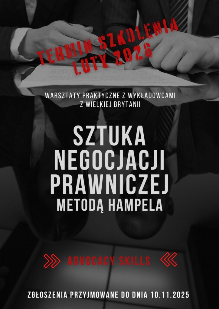 Mamy przyjemność przedstawić i zaprosić do udziału w szkoleniu „Sztuka negocjacji prawniczej metodą Hampela” będącego okazją do rozwijania praktycznych umiejętności negocjacyjnych.