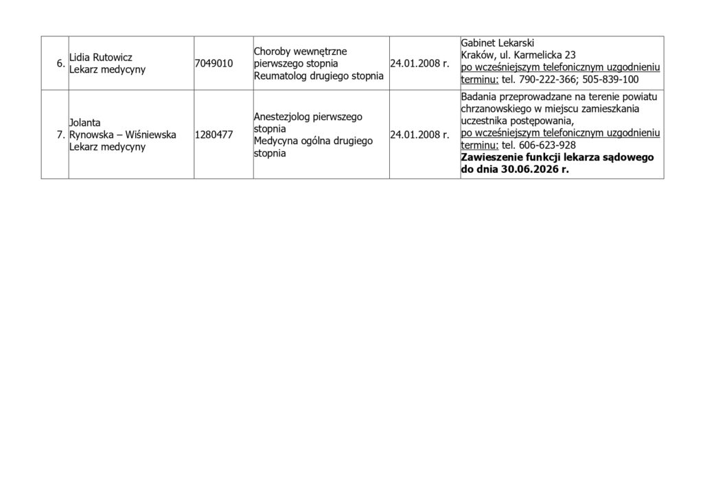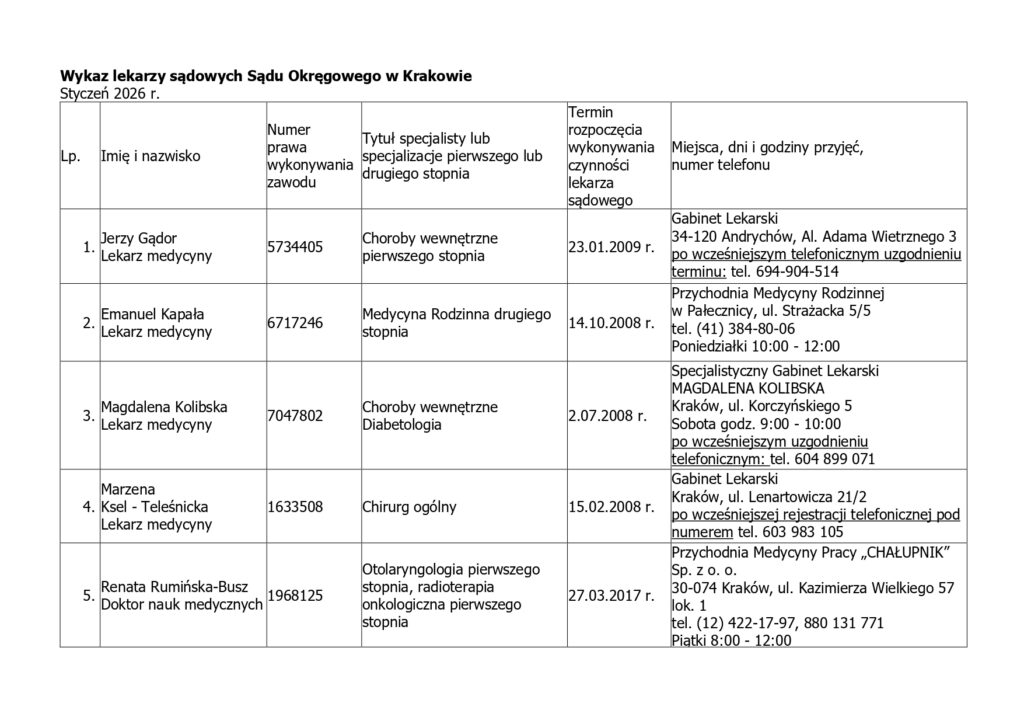 Wykaz lekarzy sądowych Sądu Okręgowego w Krakowie