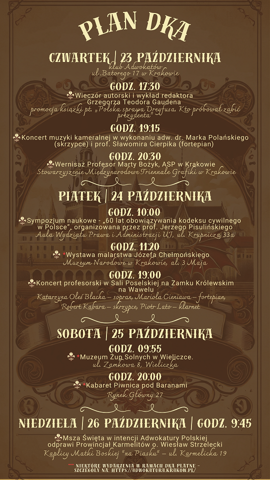 - GODZ. 19:15 – Koncert muzyki kameralnej w wykonaniu adw. dr. Marka Polańskiego (skrzypce) i prof. Sławomira Cierpika (fortepian) AM w Krakowie